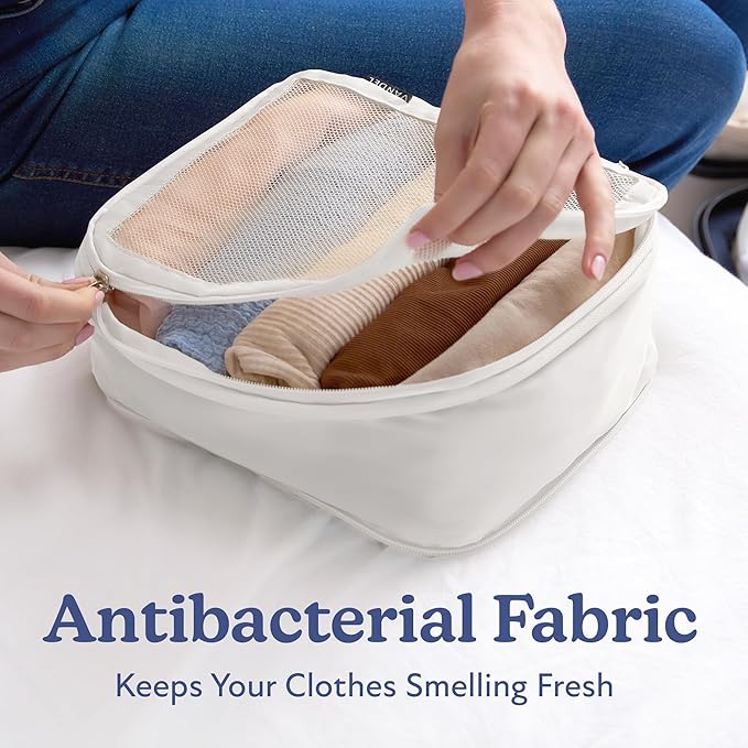 - Fabric - Made from odor-resistant fabric that’s infused with silver ions, these packing cubes for carry on suitcase and travel will always smell fresh; The breathable mesh design keeps clothing fresh and compact