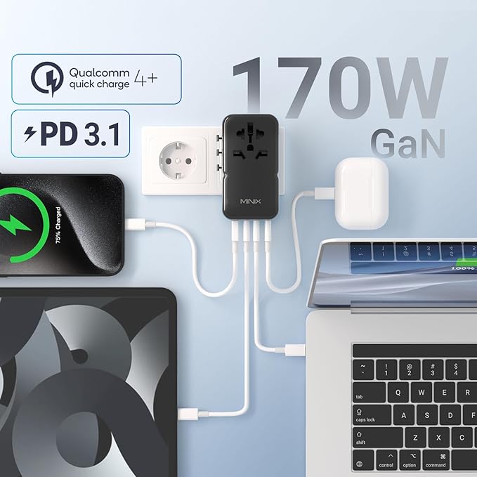 MINIX 170W Universal Travel Adapter GaN III Travel Adapter Worldwide with 3 USB-C & 1 USB-A Ports, International Power Adapter Compatible with US/UK/EU/AU for Laptops, Tablets, Phones, Cameras
