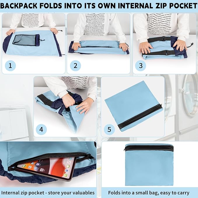 - 【Extra Pocket & Foldable】Front mesh pocket with drawstring closure provides extra storage space for laundry detergent or fabric softener. Interior zipper pocket (10.2" x 7.8") can store coins, wallet and cell phone. When not in use, flip the interior zipper pocket and fold the laundry backpack inside for storage