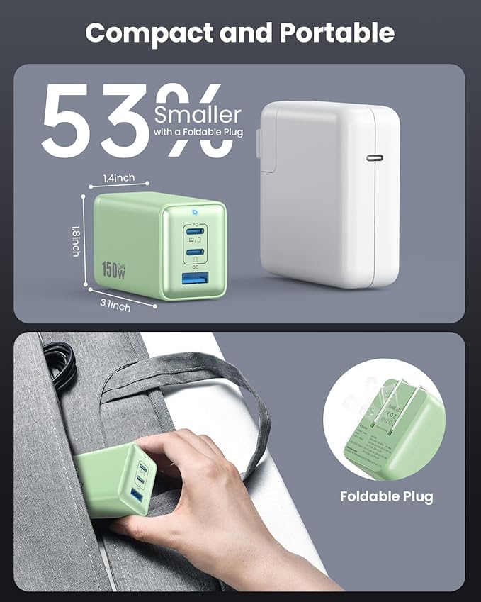 - 【Compact & Portable Design】The USB C charger block allows you to say goodbye to multiple bulky chargers. With Upgraded GaN Ultra technology, this 150W usb c power adapter equiped with a foldable plug and reduces its size by 60% compared to the original and other 150W power adapter. Size: 2.64x2.48x1.24inch, weight: 7.87oz. With such a small and portable size and weight, it is very convenient to carry.150W powerful output power and compact size add convenience to your travel.