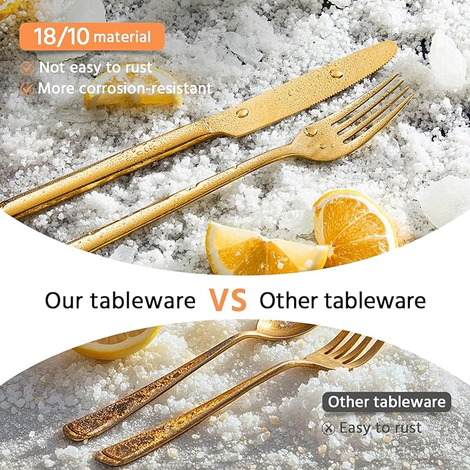 - 18/10 Stainless Steel & Comfortable: Our flatware sets are made of decent quality 18/10 gold stainless steel, nice balanced, sturdy and corrosion resistant. Thickened handles are comfortable to grip and not easy to bend