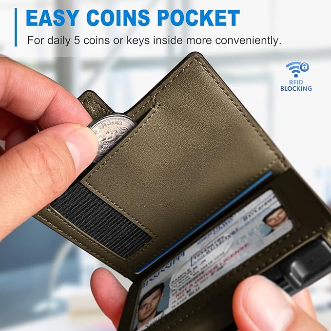 - POWERFUL CAPACITY--Slim smart wallet with refined layout to fit in front pocket,easy for 9 cards 5 coins&keys and couple of bills--5 cards in the aluminum case with pop-up access, 4 cards in the leather shell;