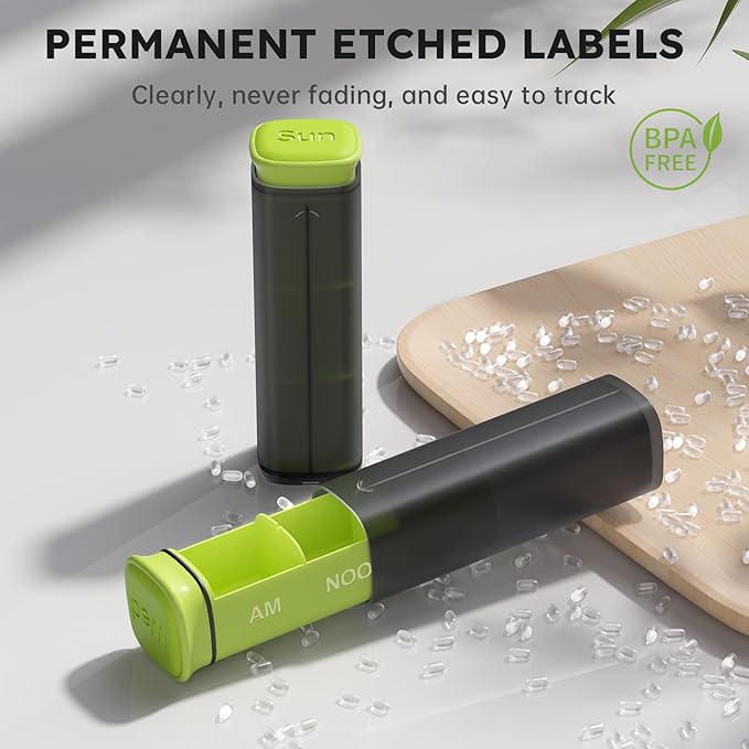 - Time-Saving & Easy to Track: The supplement organizer use intaglio printing—weekdays + AM/NOON/PM are marked on top and inside, easy to see and won't rub off. You only need to refill your meds once a week, no daily top-ups