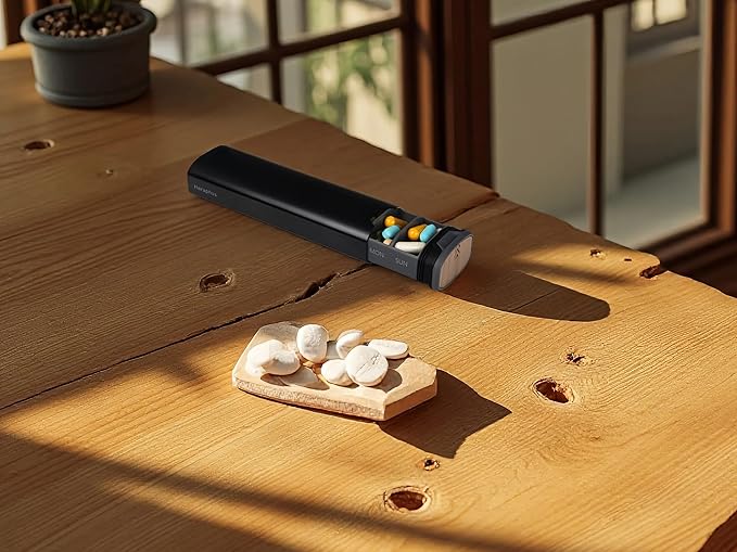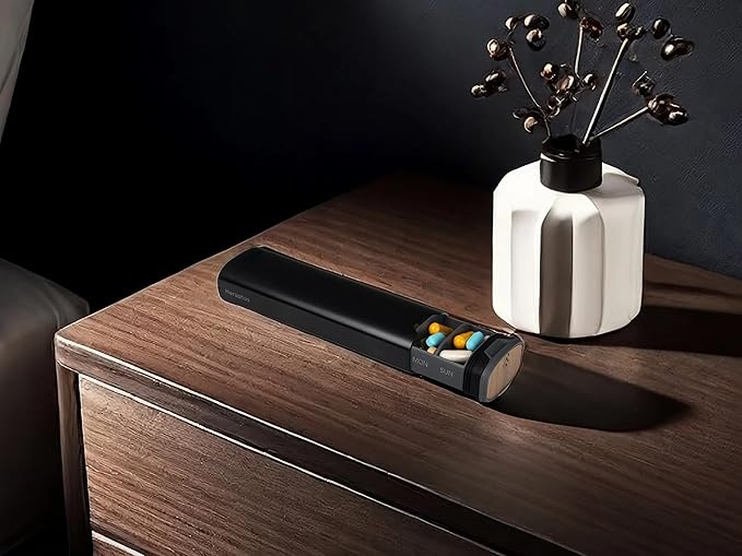 - Premium Material Construction: This pill organizer features a unique blend of high-quality aluminum and elegant wood, offering both durability and sophistication. The sleek finish ensures long-lasting use while providing a stylish, modern look.