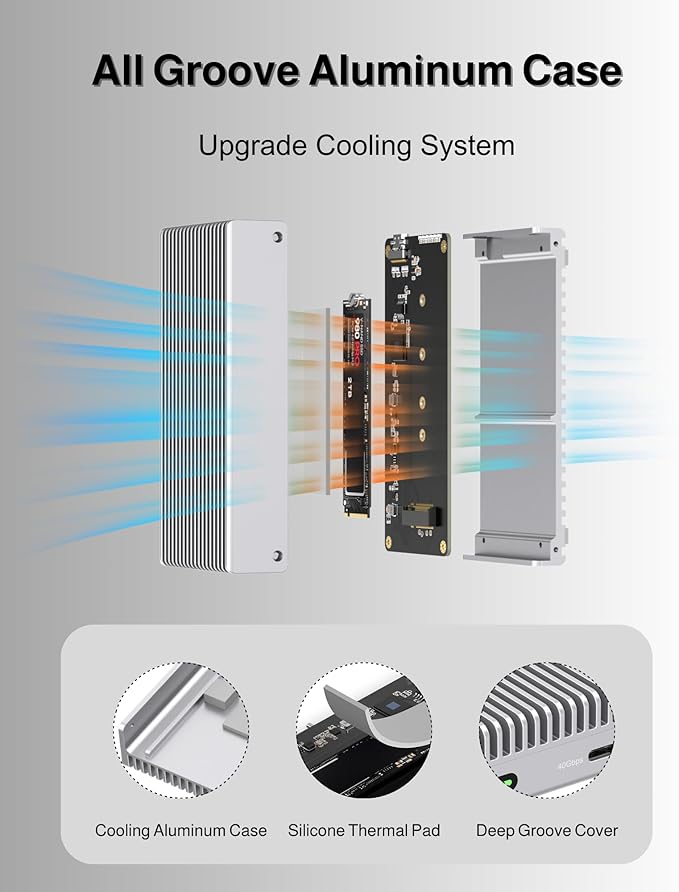 - What’s In The Box: The package includes USB 4 enlosure, coacial USB-C cable (40Gbps), velvet drawstring gift bag, quick start guide, silicone thermal pads, screw driver and screws. This product does not include any SSD, you need to buy and install the SSD by yourself.