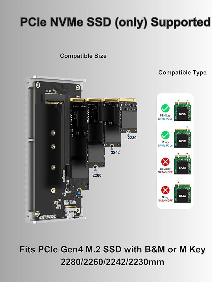 - Wide Compatibility and upto 8TB Capacity: The 40Gbps M.2 Nvme SSD Enclosure is just Plug and play with no driver installation required. The SSD external enclosure is the preferred choice for gamers, video editors, photographers, and office workers. It supports M/B+M key NVMe solid-state drives with a maximum capacity of 8TB capacity in size of 2280/2260/2242/2230mm(Note: It does not support SATA NGFF solid-state drives or mSATA solid-state drives), fix Windows/Mac OS/Linux/Android systems.