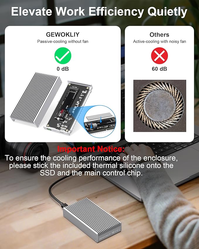 - Important Notice: To ensure the cooling performance of the SSD enclosure, please stick the included thermal silicone onto the SSD and the main control chip, so that they can come into contact with the heat-conductive aluminum casing, thereby enhancing the heat dissipation effect.