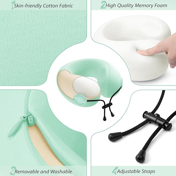 Travel Neck Pillows for Airplane Adults, Memory Foam Neck Support Travelling Pillow with Washable Cotton Pillowcases and Storage Bag, for Car, Train, Flight, Office and Home Use Adult Green
