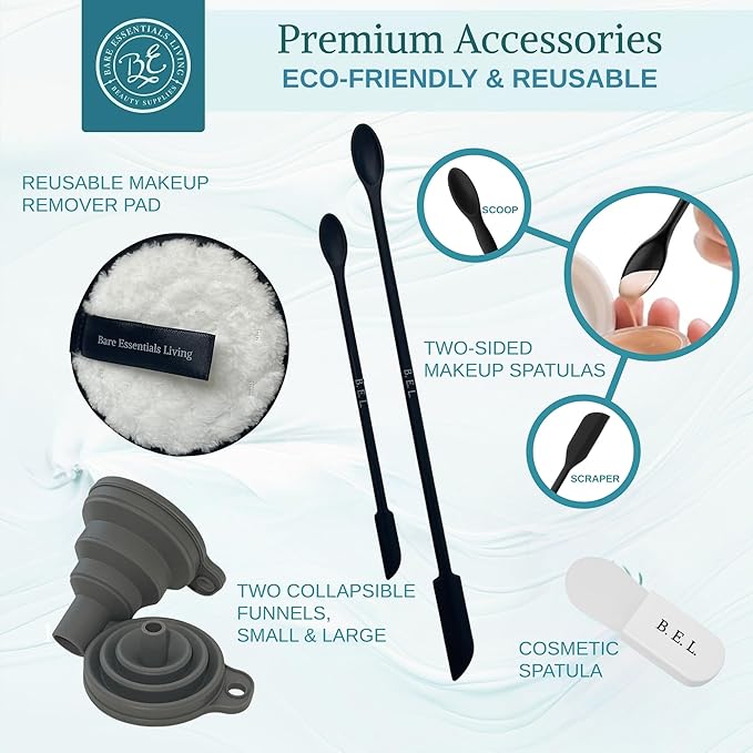 - Premium Mini Travel Containers: Do not use cheap plastic travel containers with your expensive serums, moisturizers, and creams. Use our high-quality glass travel containers to protect your skincare products from plastics and other nasties. Easily transfer your beauty products from larger containers using the included mini makeup spatulas, collapsible funnels and glass travel bottles for toiletries.