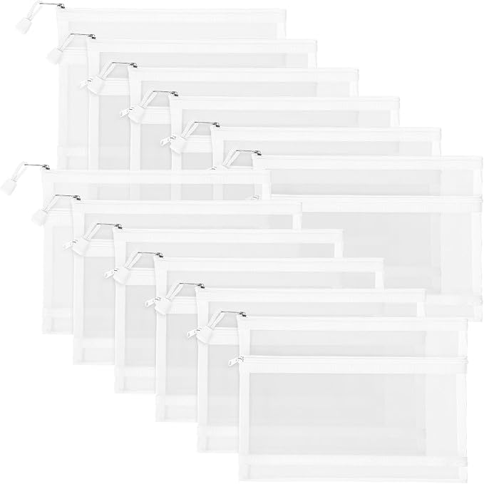 12 Pieces Zipper Nylon Mesh Pouch, Mesh Cosmetic Bags Makeup Bags Pencil Case, Multipurpose Travel Bags for Cosmetic School Office Supplies and Travel Accessories (2 Layers-White, A5)