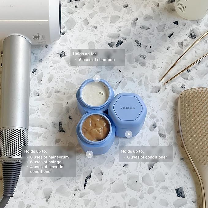 Cadence Travel Containers Haircare Capsule Set - Magnetic Containers with Lids,Carry On Travel Essentials For Women/Men - 3 Flex Mediums (1.32oz) - Shampoo, Conditioner & Comb Icon Labels - Pacific