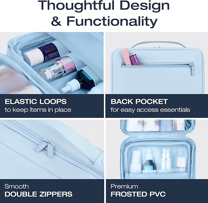 - EFFORTLESS ORGANIZATION: Thoughtful functionality and multiple compartments that allow for efficient storage and organization of all your essential items. Easy to hang and use for a range of toiletries or cosmetics on your travels or as an everyday toiletry bag.