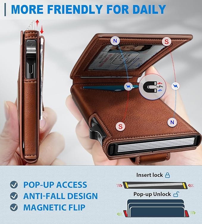 - AMPLE STORAGE--Easy for 9 cards and holds Airtag,Slim wallet with refined layout to fit in front pocket,the money clip with Leather wrapped for carry cash,5 cards in the aluminum case with pop-up access,4 cards in the leather shell;