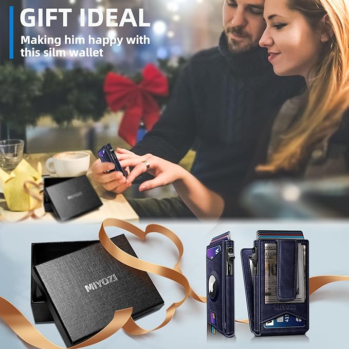 Airtag Wallet for Men,with Money Clip Gift Boxed,Slim Front Pocket Wallet RFID Blocking Metal Case Smart Pop-up Credit Card Holder in Magnetic Leather Flip