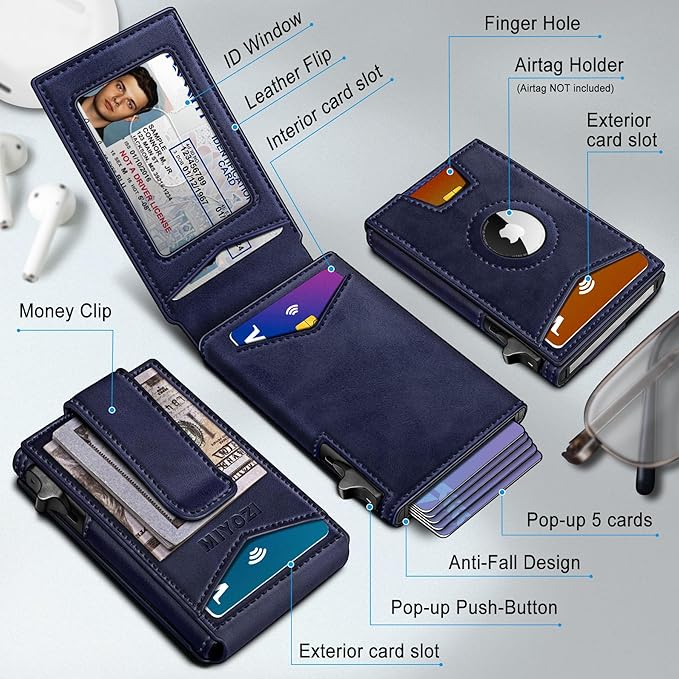 - AMPLE STORAGE--Easy for 9 cards and holds Airtag,Slim wallet with refined layout to fit in front pocket,the money clip with Leather wrapped for carry cash,5 cards in the aluminum case with pop-up access,4 cards in the leather shell;