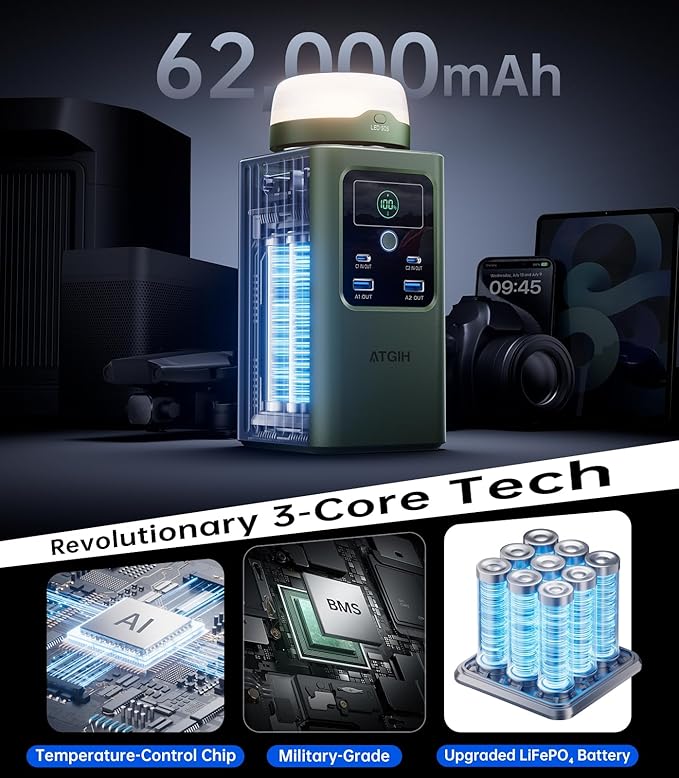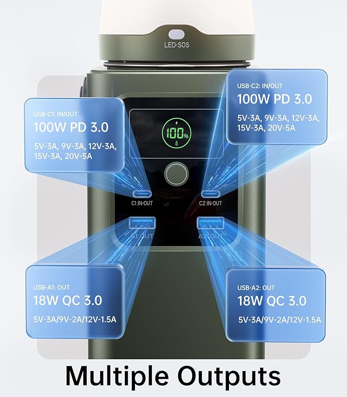 - Special Feature : 198.4Wh Mega Capacity, 4 Device Charging Ports, Compact, Portable, 4-Mode Camping Light, LED Display, Military-Grade BMS, AI Temperature-Control Chip, Upgraded LiFePO₄ Battery, PD 100W USB-C, QC 18W USB-A, Fast Charging, Short Circuit Protection, Over Charge Protection, Overload Protection, Over-Voltage Protection 198.4Wh Mega Capacity, 4 Device Charging Ports, Compact, Portable, 4-Mode Camping Light, LED Display, Military-Grade BMS, AI Temperature-Con… See more