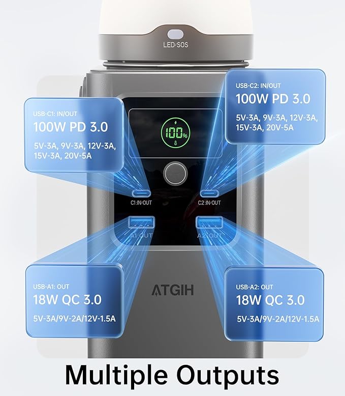 - 【What is in the Box?】ATGlH Portable Power Station with Camping Light, 9V/12V USB-C to DC Cable*2 (Powers DC-port devices: routers, modems, drones, and more.), USB-C to C Cable, Instruction Manual. Our specialists are always online for you.