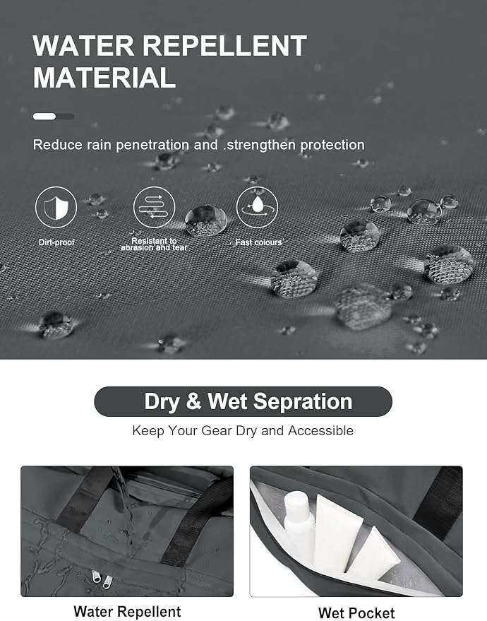 - 【Waterproof & Wet Pocket】Crafted from high-density waterproof material, the gym duffle bag keeps contents dry. It features a separate compartment for wet items like clothes or towels.