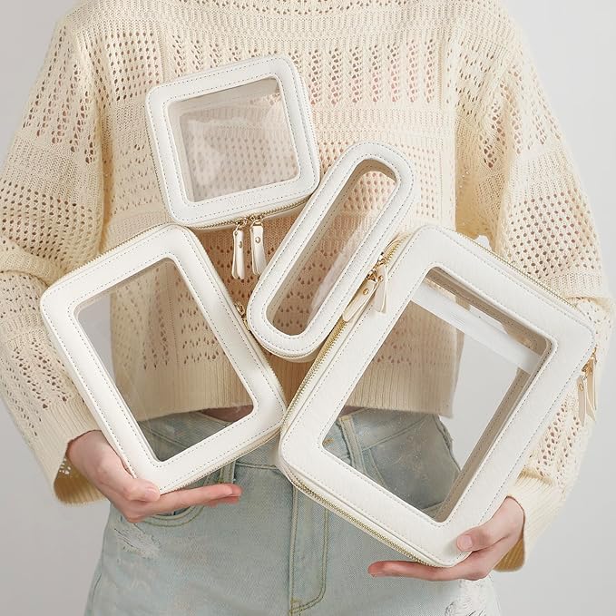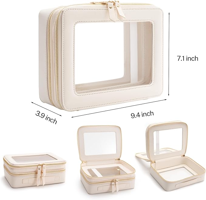 - ❤【STYLISH & PREMIUM QUALIYY】Unlike other flimsy and collapsible pvc bags, our 2-layer cosmetic pouch which made of premium saffiano PU leather and thick vinyl can keep a good structure. Together with the beautiful stitches and whisper-quiet metal zippers, this make up bag is durable for long-lasting use. It's the clear pouch you'd be happy with sitting out on display beside you.