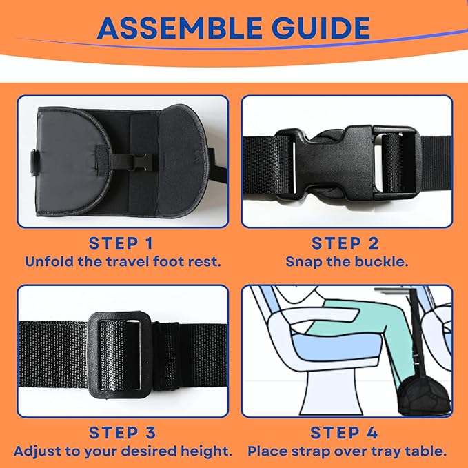 - Enjoy Comfort In Minutes - Snapping the buckle, hang the travel footrest on the tray table, adjust the strap to your desired length, put your feet on airplane footrest and relex. That's all it takes to enjoy comfort during long flights. With added length to the adjustable strap, our foot sling is suitable for almost all heights, including kids. Not limited to airplane travel, our footrest is perfect for use on train, bus, under desk, and even in car, providing leg relaxation anywhere you go.