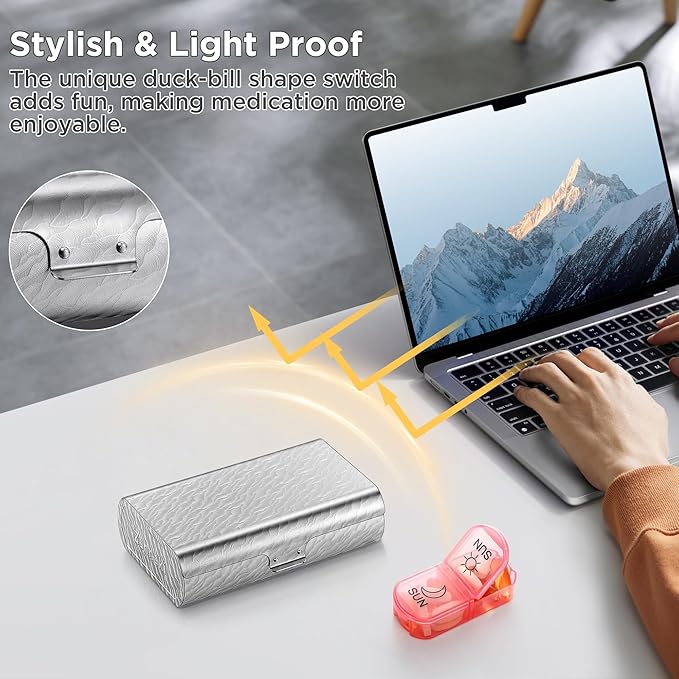 - Professionally Certified Safe Quality: The outer shell of this 7 day pill case is lightweight and crush-resistant, made of ultra-sturdy anodized aluminum. The internal pill container is made of BPA-free, food-grade material. These premium materials ensure a sleek and stylish look and provide ultra-safe use. The solid quality can withstand the test of time and provide you with long-lasting service.