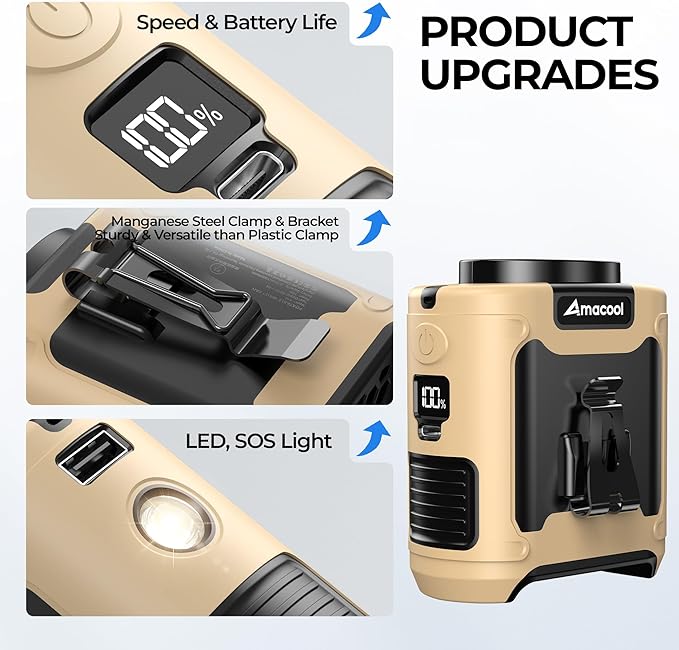 - 40H Max Running: AMACOOL waist clip fan is designed with buyer's needs in mind, providing up to 40 hrs of continuous airflow at wind speed 1 with the 10000mAh built in battery, it lasts up to 8 hrs even in the strongest speed, greatly reduces the number of recharges, LED display let you know when to charge; Feature with a 5V-2A USB output port to charge your phone in emergency