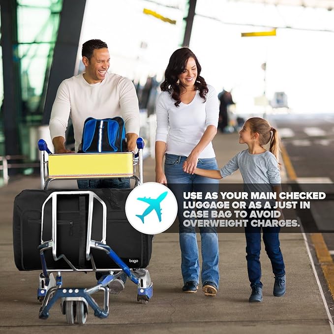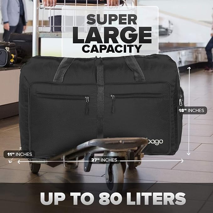 Bago Large Foldable Duffel Bags for Traveling Women & Men - 80L Packable Duffle Bag for Travel with Shoe Compartment - Water Repellant, Heavy Duty, Lightweight Folding & Collapsible (All Black)