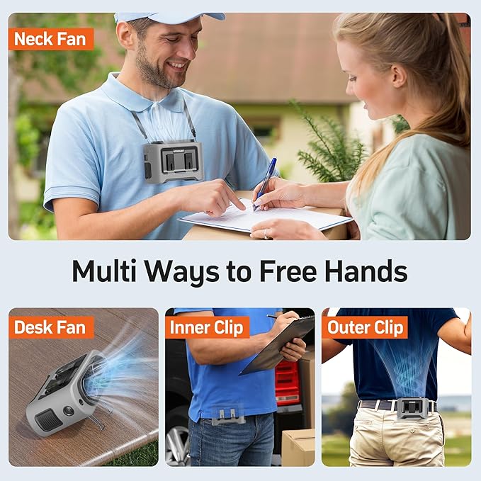 - 2X Air Outlets: Equipped with dual motors and air outlets, this clip fan offers stronger airflow and larger cooling coverage. Also comes with 2X belt clips, shirt clips, stands, and a lanyard, making it perfect for hands-free use during hiking, climbing, or biking