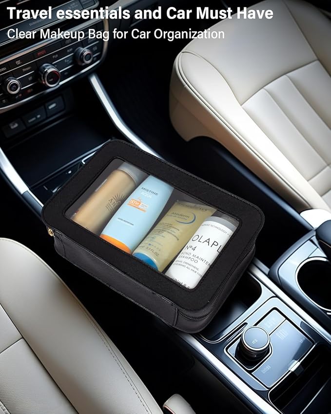 LETGO Clear Makeup Bag, Travel Cosmetic Case Toiletry Bag Make up Organizer Skincare Pouch for Women, Car Essentials Bag with Clear Windows (Black, Standard)