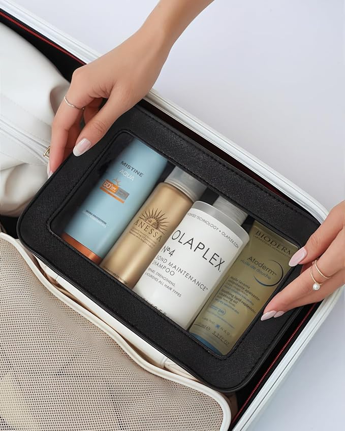 - Roomy and Stylish:Measuring Standard Size 9.25'' x 6.1'' x 2.75''(23.5cm x15.5cm x 7cm), Mini Size :5'' x 4.7'' x 2''(12.7cm x 12cm x 5cm)our clear makeup bag is elegant ,and stylish, this makeup travel organizer was designed in a minimalist boxy shape and Crafted in beautiful PU leather and finished with polished hardware, the trendy makeup bag is easy to carrying in your handbag or carry-on.