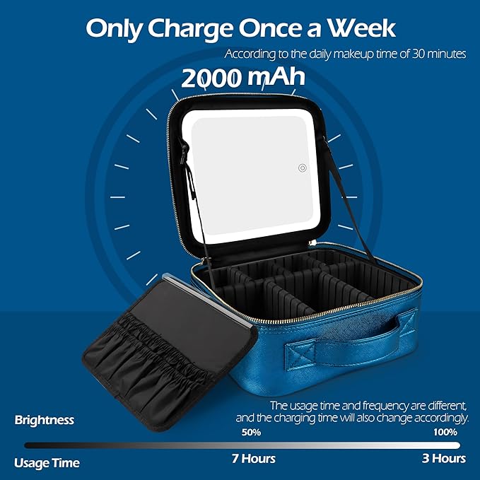 MOMIRA Travel Makeup Bag Cosmetic Bag Makeup Organizer Bag with Lighted Mirror, Adjustable Brightness in 3 Color Scenarios, Waterproof Makeup Train Case, Gift for Women - Phantom Blue