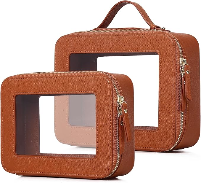Pinkmik Clear Makeup Bag for Women Waterproof Travel Cosmetics and Toiletries Case Portable Makeup Oaganizer Bag Clear Car Bag with Zipper (X/Brown, M+L)