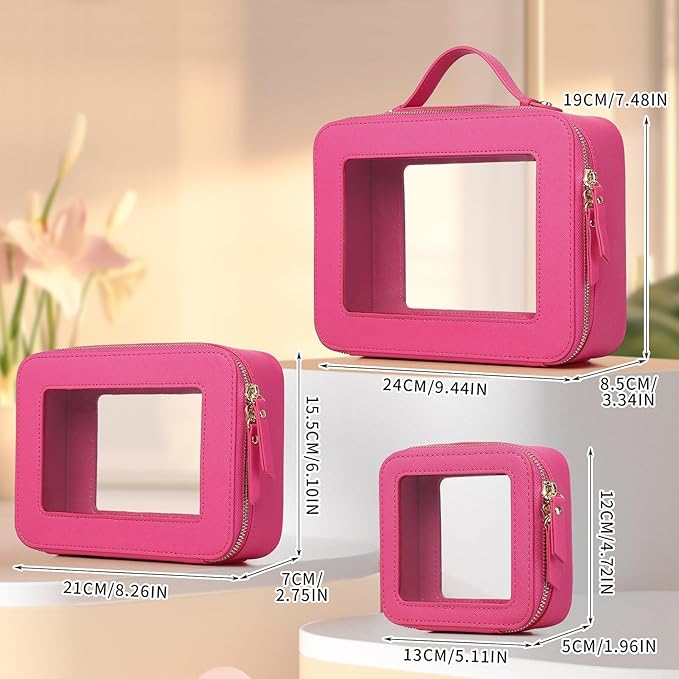 Pinkmik Clear Makeup Bag Waterproof Travel Case for Cosmetics and Toiletries Women's Purse Organizer and Clear Car Bag with Zipper (X/Fuxia, L+M+MINI)