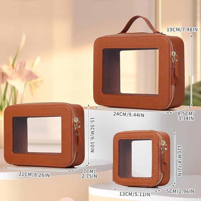 Pinkmik Clear Makeup Bag Waterproof Travel Case for Cosmetics and Toiletries Women's Purse Organizer and Clear Car Bag with Zipper (X/Brown, L+M+MINI)