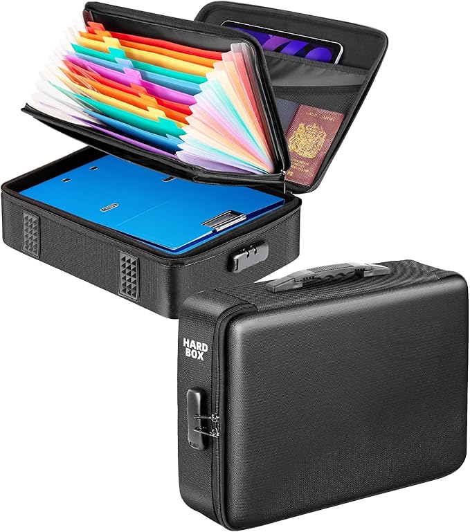 - Hard Shell File Box: File box adopts breakthrough design that combines fireproof materials and hard shell materials, maintaining fireproof performance while enhancing durability. Double zipper and password lock design for easy opening and closing, effectively prevent important documents and valuables from being peeped and stolen. Sturdy handle, easily carry everything.