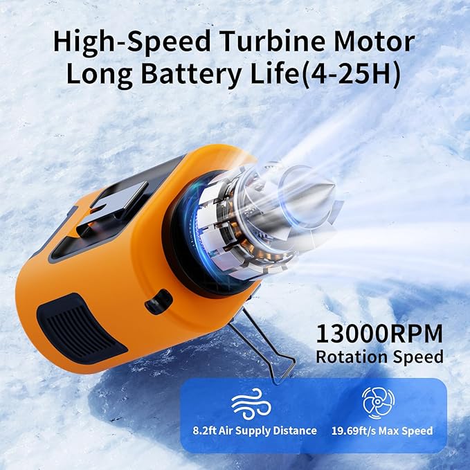 - 【5-in-1 Multifunctional Waist Clip Fan】This portable waist fan is equipped with a 5000mAh rechargeable battery that can run continuously for up to 25 hours at low speed. An integrated waist clip fan, desk table fan, handheld fan, and neck fan. Clip the fan onto your shirts, belts, and pants, or hang the personal fan around your neck with the lanyard. Prop it up on a table with a kickstand on the body fan, keeping hands completely free