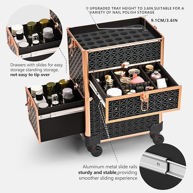 Makeup Train Case with Drawer, Rolling Makeup Case, Cosmetology Case on Wheels, Gift, Large Makeup Case Organizers, Professional for Salon Barber, Nail, Tattoo, Black Gold