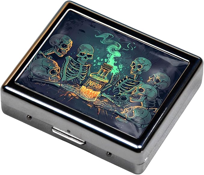 7 Days Chromed Shiny Silver Pill Organizer with Mirror Inside Has 8 Separate Compartments Rectangle Cute Travel Pill Organizer for Purse 7 Days (Skull Poison)