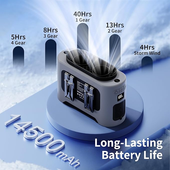 - 【Long Lasting Working Time】The waist rechargeable fan runs for up to 40 hours on low speed and takes 6.5 hours to fully charge. It lasts 4 hours on maximum wind speed and supports charging while in use, keeping you cool all day (No Standalone lithium batteries are sold with the product)