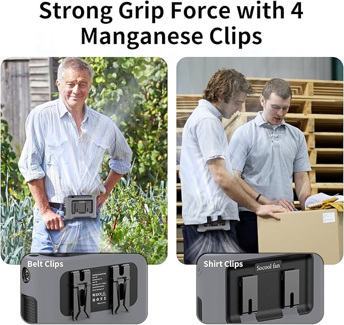 - 【Belt Fan with 4 Manganese Clips & Silicone Cover】The Portable Cooling fan includes two belt clips and two shirt clips, providing enhanced grip strength. The practical design with four clips facing opposite directions allows for versatile placement options as well as a high-quality protective silicone outer cover design for protecting against shocks and drops