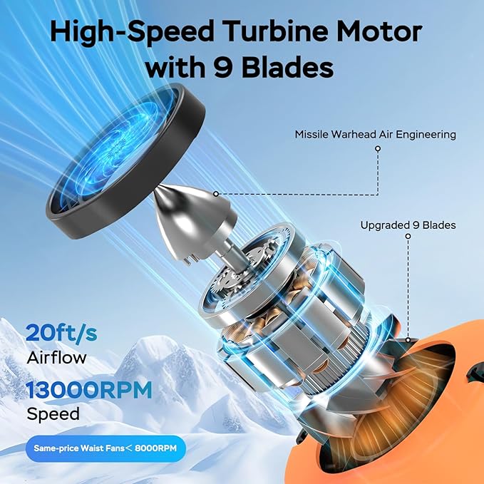 - 【Cool Off in Seconds】- This latest hands-free belt fan adopted the High-Speed Turbine Motor and Patented Missile Warhead Shape Air Engineering with 9 blades. It spins at robust speeds from 6100 to 13000 RPM (4 speeds) and generates airflow up to 20 ft/s, moving an immense volume of air and removing sweat and heat in seconds. A summer essential for outdoor workers: construction workers, gardeners, couriers, athletes, rooftop installers, farmers, hikers, campers, police