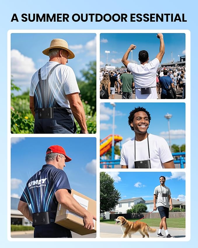 - Versatile and Portable: This shirt fan offers a versatile design, allowing it to be used as a waist fan, desk fan, or neck fan for flexible cooling. Ideal for construction sites, gardening, theme parks, camping, or walking your dog