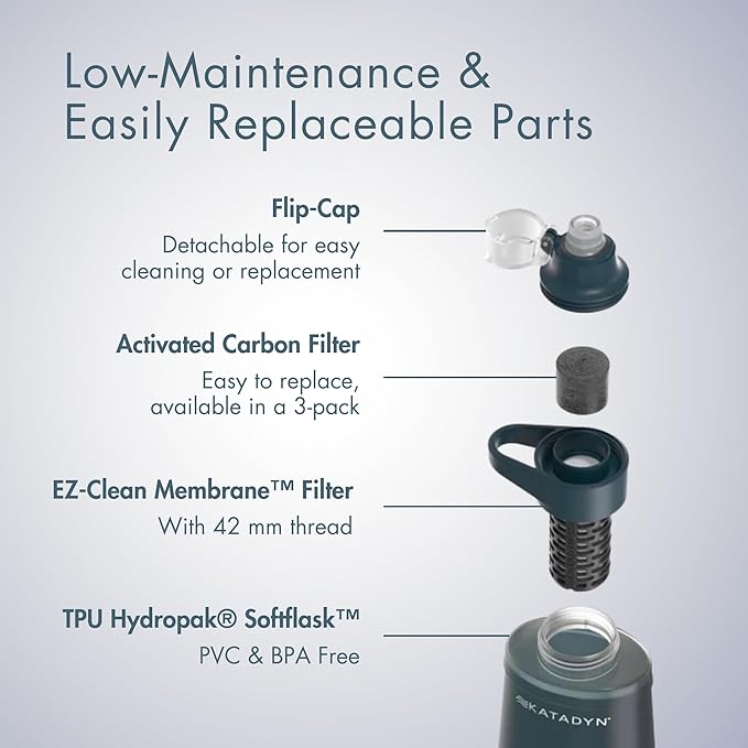 - VERSATILE FILTRATION FOR ANY WATER SOURCE: Activated carbon enhances taste from treated tap water, while the EZ Clean Membrane ensures safe hydration from natural sources.