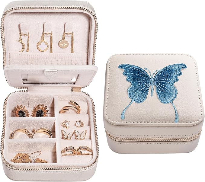 S.Leaf Travel Jewelry Organizer Boxes for Women Small Portable Necklace Earrings Bracelet Rings Travel Case Best Friend Birthday Gifts for Women Trendy (Butterfly_Beige_Blue)