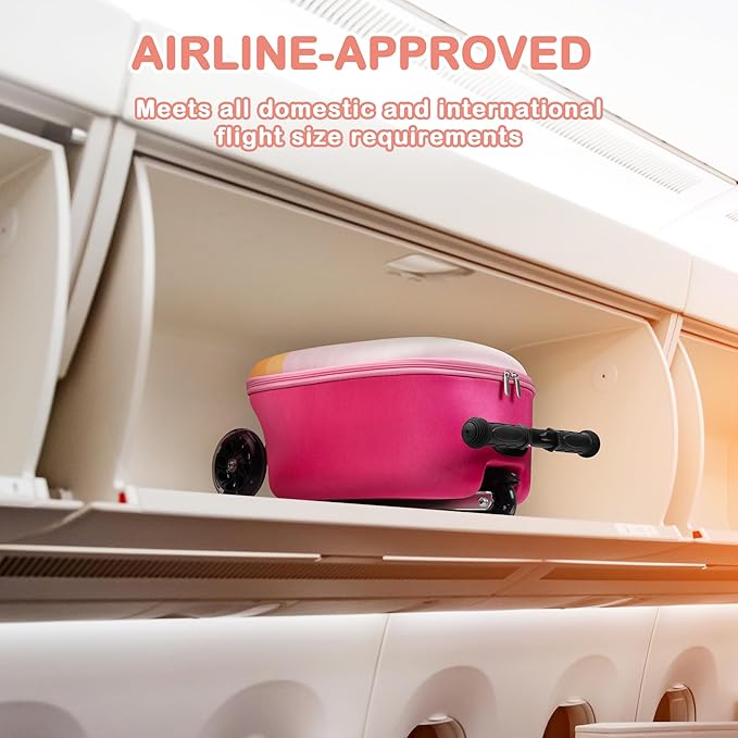 - 【COOL DESIGNS】a. The telescopic handle is equipped with a safety mechanism that is both convenient and safe. b. Built-in LED lights, the scooter luggage adds a cool, playful touch to airport transport and in dim-light situations.