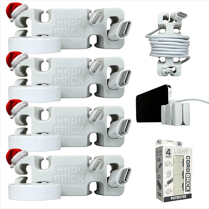 CordBrick Stocking Stuffers for Adults Cord Management Weighted Cord Holder Cable Wrap Phone Stand - Multiuse Gadget Organizer for Nightstand, Desk. Gift for Men, Durable Silicone. 4pk Light Gray