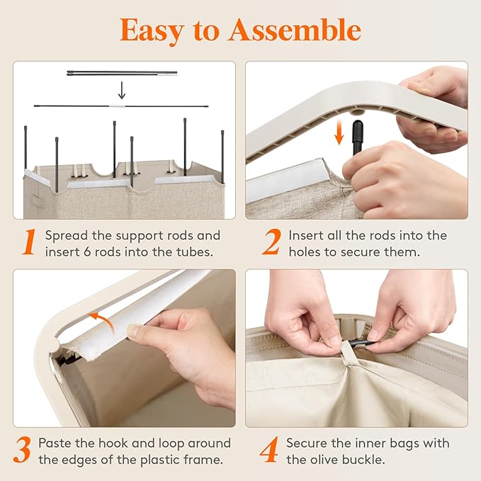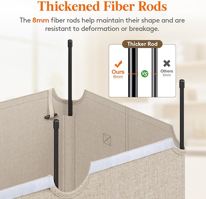 - Structural Stability: The laundry hamper with lid uses hook & loop to attach the main body to the plastic frame, ensuring that the hamper stays more even. The 8mm thick fiber rods are directly fixed to the plastic frame, making the basket stable and preventing the rods from poking through