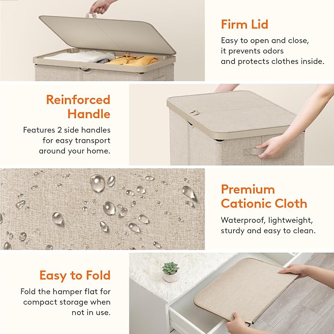 - With Lid and Removable Bag: The laundry hamper with 2 sections includes three removable inner bags and two reinforced handles on both sides, making it easy to carry to the laundry room without moving the entire basket. The lid design prevents odors, providing a neat environment