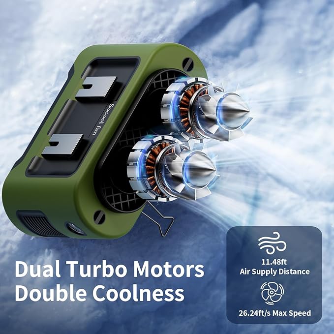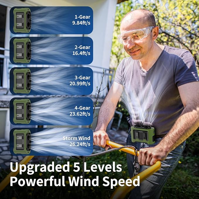 - 【5 Levels Power Wind & Dual Motors】Equipped with dual hight-speed turbo motors, the personal waist fan can reach a maximum speed of 14600 RPM, generating airflow up to 26.24 ft/s and an air supply distance of 11.48 ft. With five adjustable speed settings, from natural to gust, it’s perfect for construction workers who need powerful cooling in high temperatures