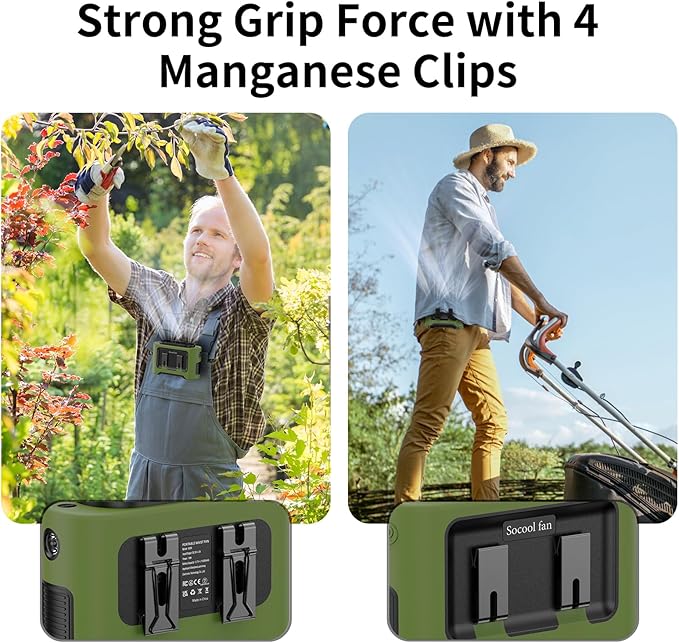 - 【Belt Fan with 4 Manganese Clips & Silicone Cover】The Portable Cooling fan includes two belt clips and two shirt clips, providing enhanced grip strength. The practical design with four clips facing opposite directions allows for versatile placement options as well as a high-quality protective silicone outer cover design for protecting against shocks and drops